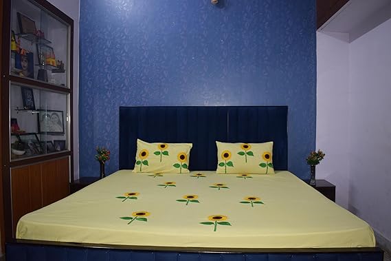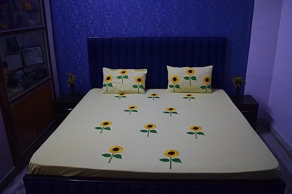Bring home the charm of handcrafted beauty with this premium Swadha Hand-Embroidered Cotton Bedsheet Set. Made from soft and breathable 100% cotton fabric, this bedsheet features stunning sunflower embroidery carefully stitched by skilled artisans. The refreshing yellow color paired with bright sunflowers creates a cheerful and elegant look that enhances any bedroom dĆ©cor. This set includes 1 double bedsheet and 2 matching embroidered pillow covers, making it perfect for everyday use or special occasions. The fabric is durable, comfortable, and easy to maintain with long-lasting color quality. Whether you’re redecorating your room or looking for a thoughtful gift, this sunflower embroidered bedsheet set is an ideal choice for elegance and comfort.Bright & Vibrant Design: Yellow base with sunflower motifs brings a refreshing and lively vibe to any room. Durable & Easy Care: Long-lasting color, machine-wash safe, does not fade easily. Perfect for Gifting: Suitable for housewarming, anniversaries, festive gifts.